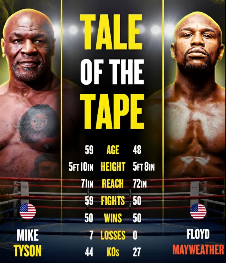 Both Tyson and Mayweather have been retired for some time, with Tyson currently 59 years old and Mayweather 48. Tyson has fought 59 professional matches, securing 50 wins, 44 of which were by knockout, with only four losses and two no contests.